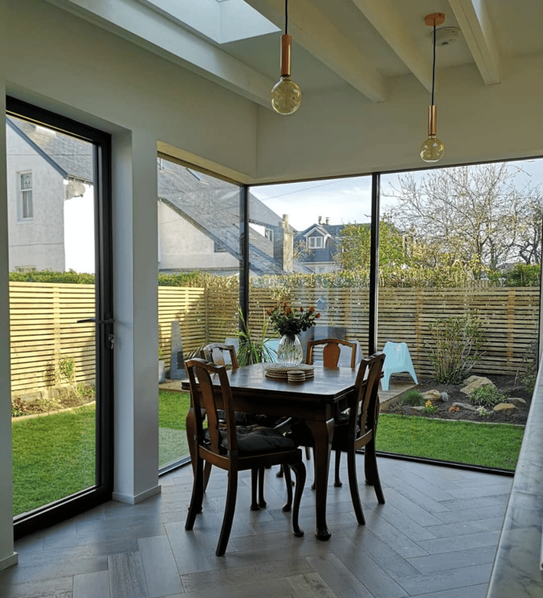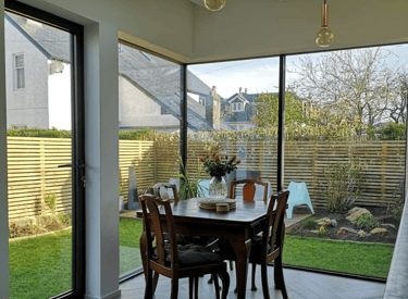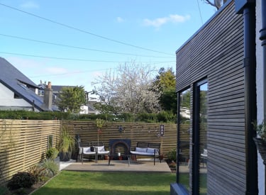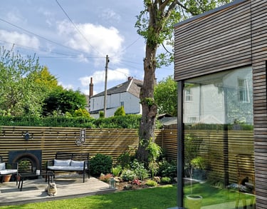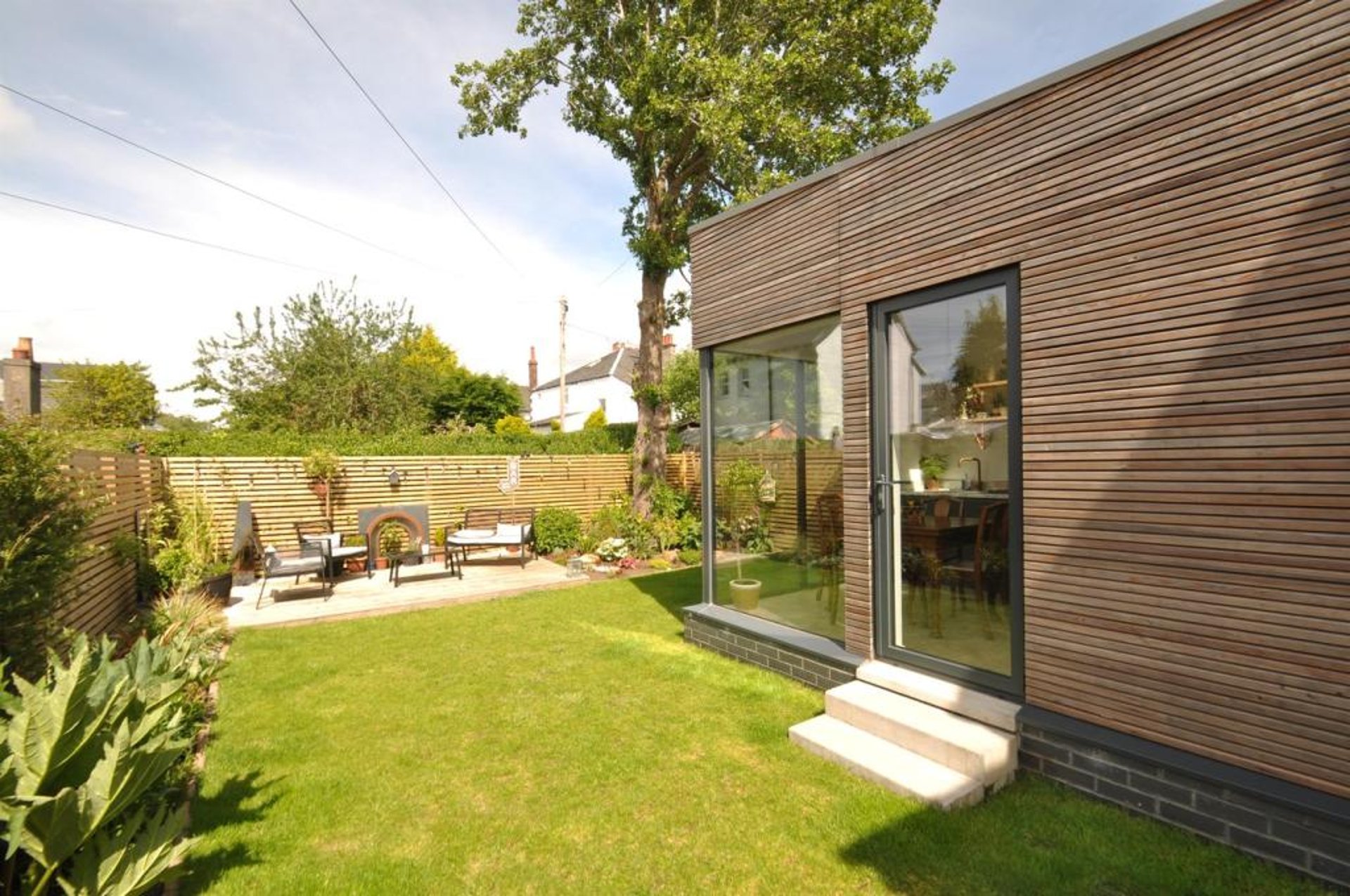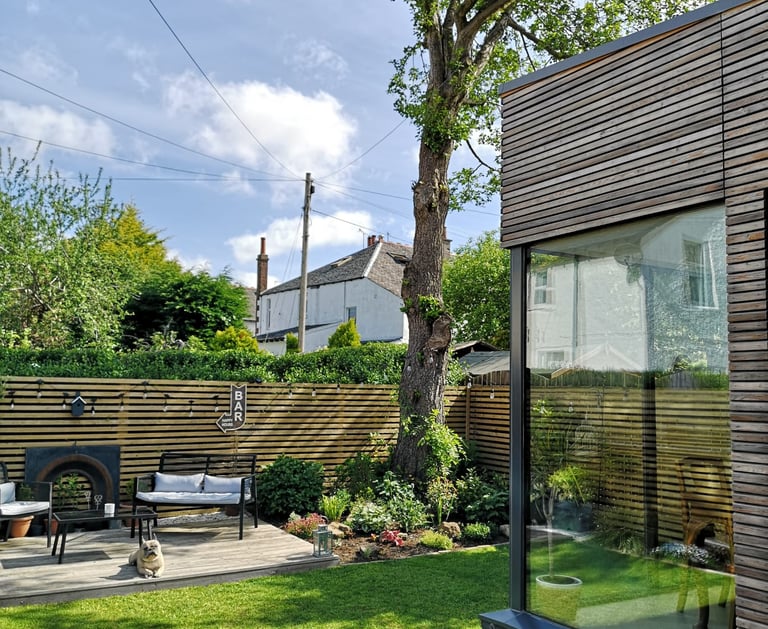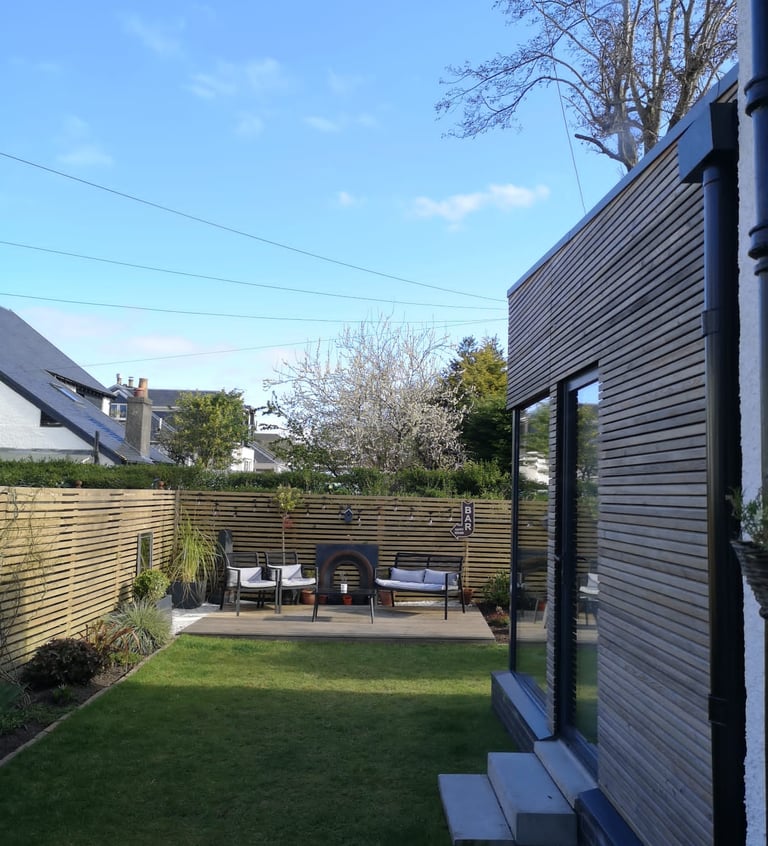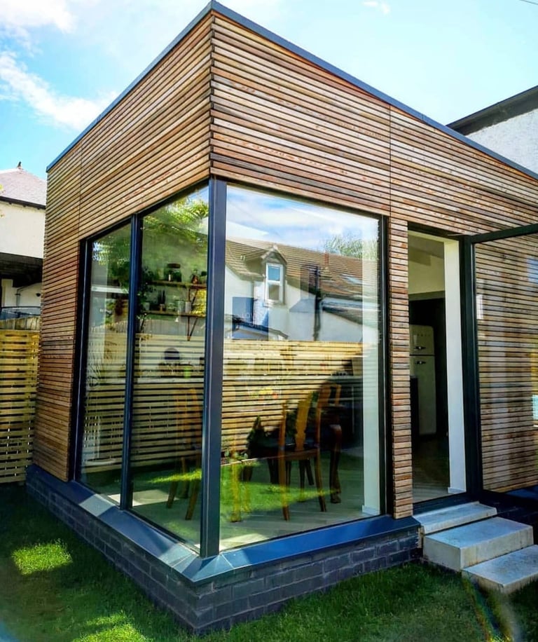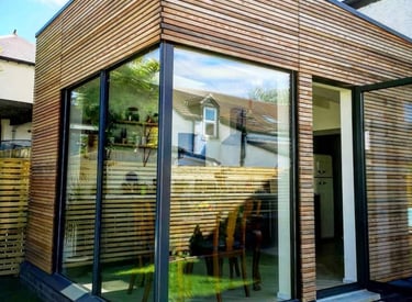 This stunning timber clad rear extension seamlessly blends form and function, creating an inviting open-plan kitchen and dining space perfect for both family gatherings and entertaining guests. The horizontal siberian larch cladding bring warmth and texture to the garden, while the large frameless glass corner window floods the kitchen/diner with natural light, enhancing the spacious feel. Designed with modern living in mind, this extension not only opens up the home but also showcases exquisite craftsmanship that beautifully complements the existing architecture.